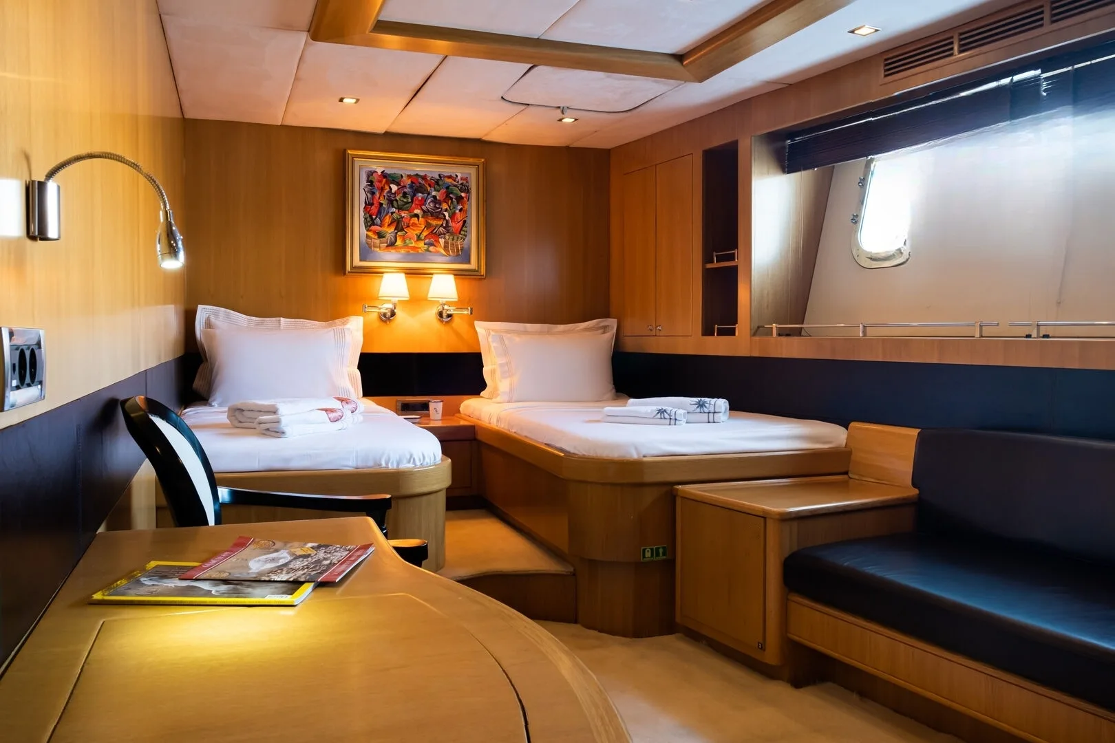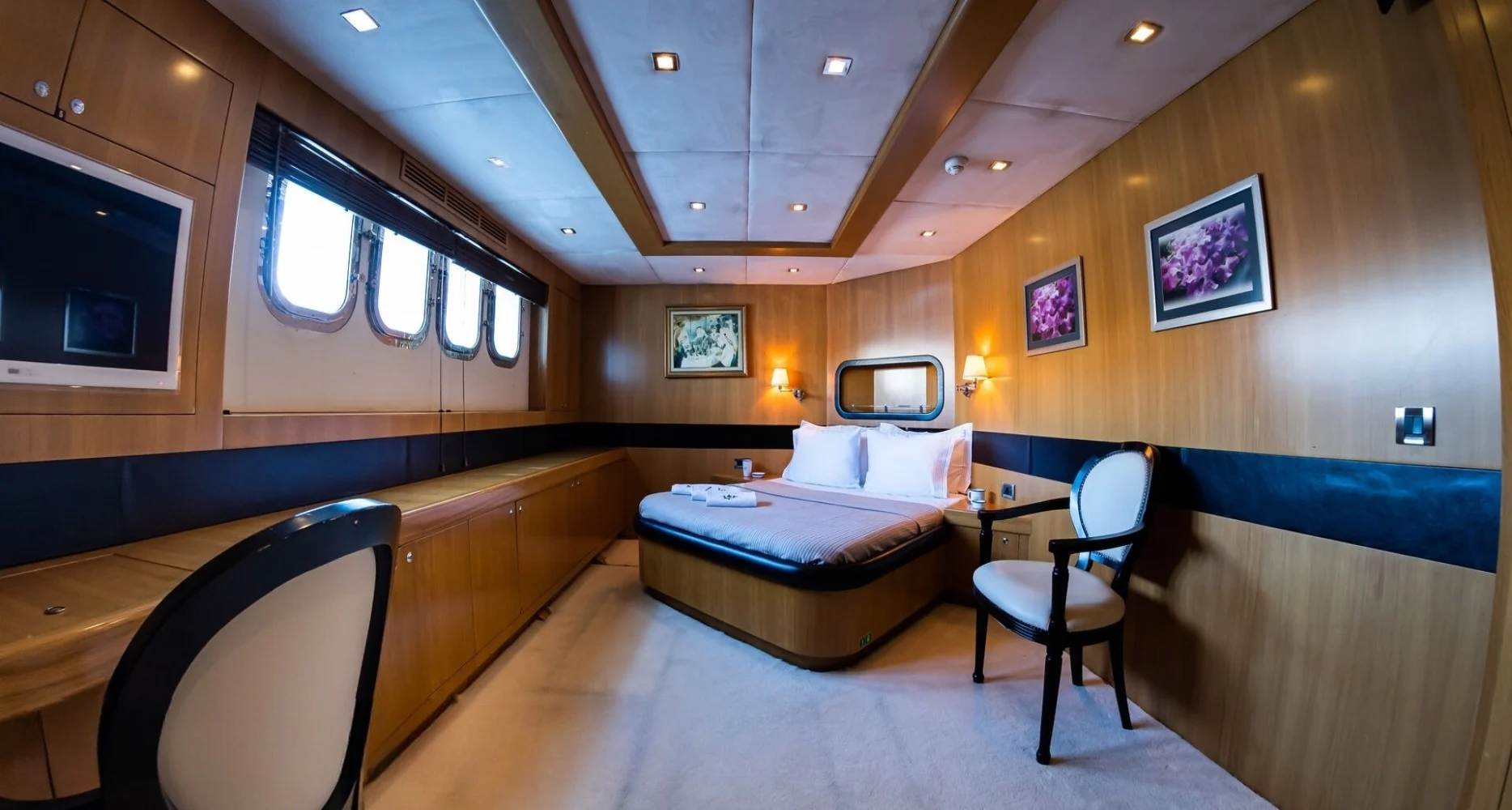Smyrna’s accommodations are designed to envelop you in comfort and sophistication. Hosting up to ten guests, her five beautifully appointed cabins offer a sanctuary of tranquility. Waking up to the gentle sway of the sea in a lavish master suite or one of four elegant double cabins rivals the finest experiences of any five-star retreat. Each cabin, with its thoughtful design and subtle opulence, promises restful nights and rejuvenated mornings, enhancing the intimate luxury of your journey.