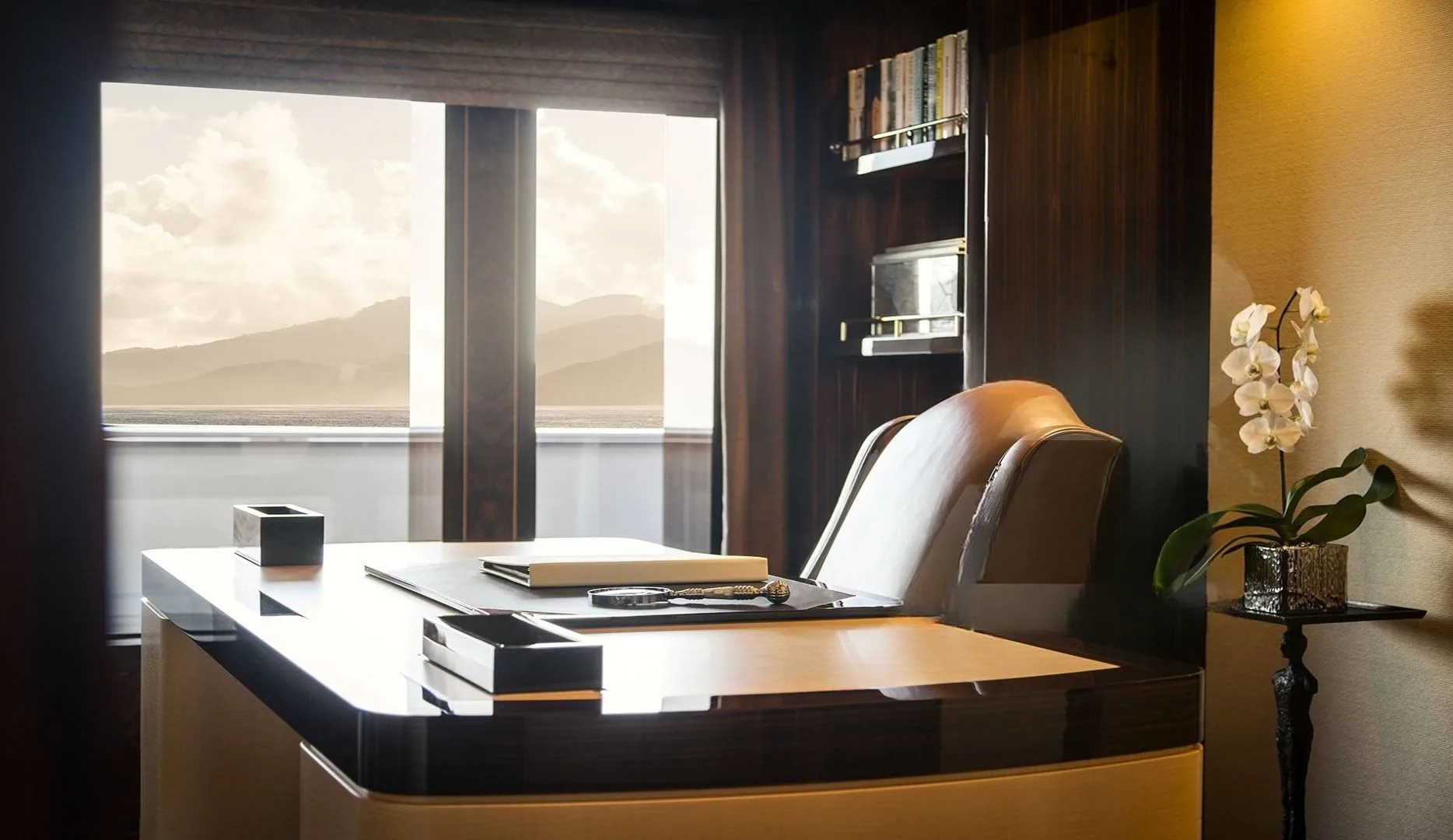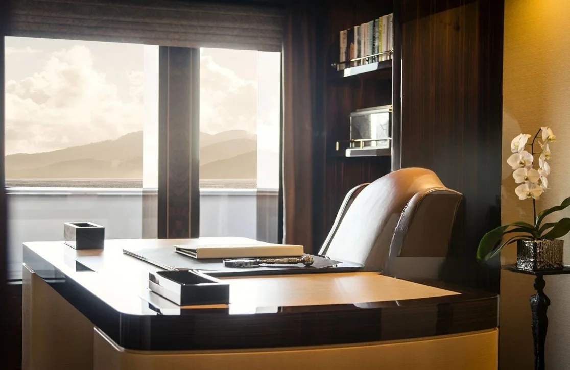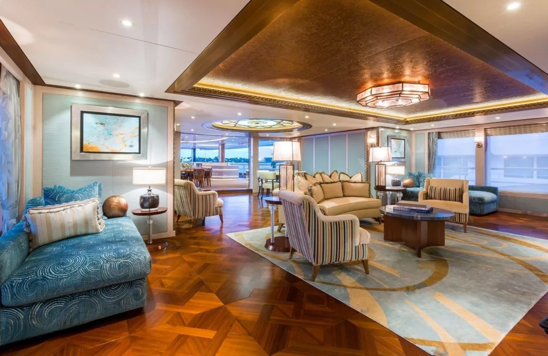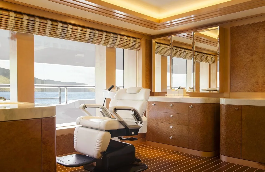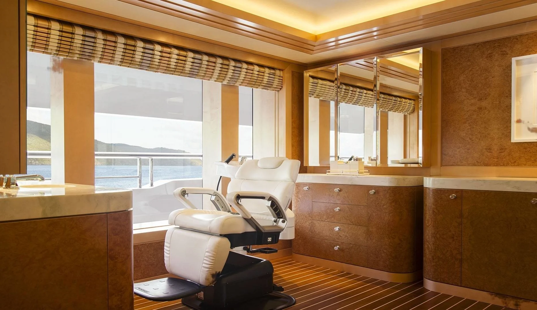 SOLANDGE accommodates up to 12 guests across eight elegantly appointed staterooms, each a sanctuary of comfort and style. The master suite, with its panoramic views and private deck, offers a serene retreat, while the VIP suite can be tailored into two spacious cabins. As you awaken to the gentle sway of the sea, the intricate stonework and artisanal furnishings create a sense of timeless grandeur. Each room, uniquely decorated, reflects the yacht’s commitment to exquisite design, ensuring that your stay is as restful as it is inspiring.