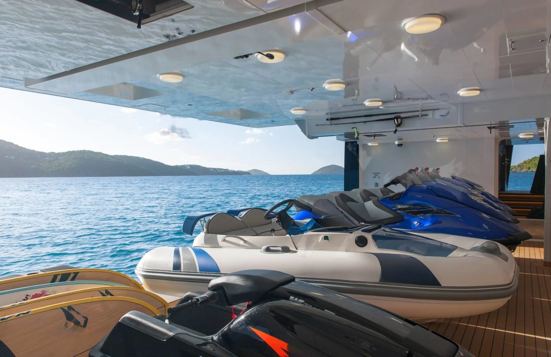 Aboard SOLANDGE, every detail is curated to enhance your experience. The upper deck, with its chic beach club ambiance, is perfect for sunset gatherings, while the wellness spa invites you to unwind with a massage or sauna session. As night falls, the main salon transforms into a vibrant social hub, where the flicker of the firepit and the glow of the Schonbeck chandeliers create an enchanting atmosphere. The yacht’s dance floor and DJ booth offer the ideal setting to celebrate under the stars, while the movie theatre provides a cozy retreat for cinematic indulgence. With stabilizers ensuring a smooth journey, your comfort is always assured.