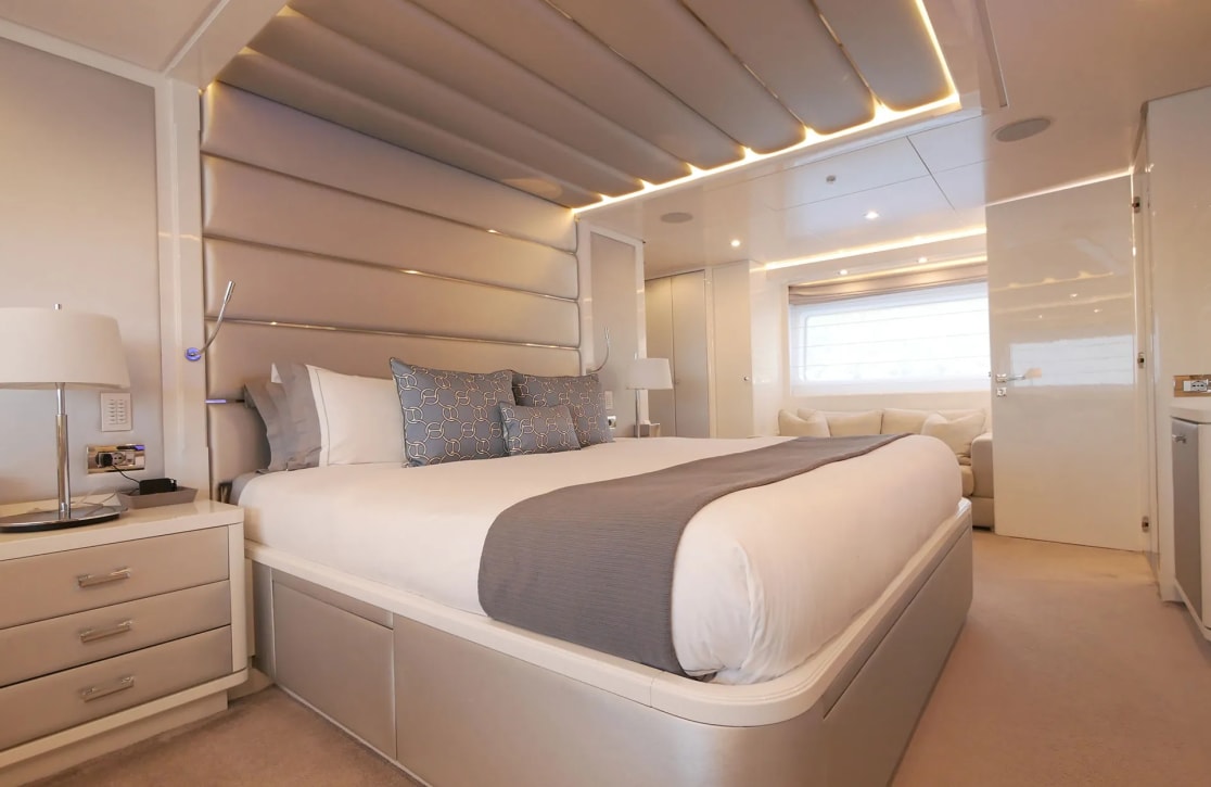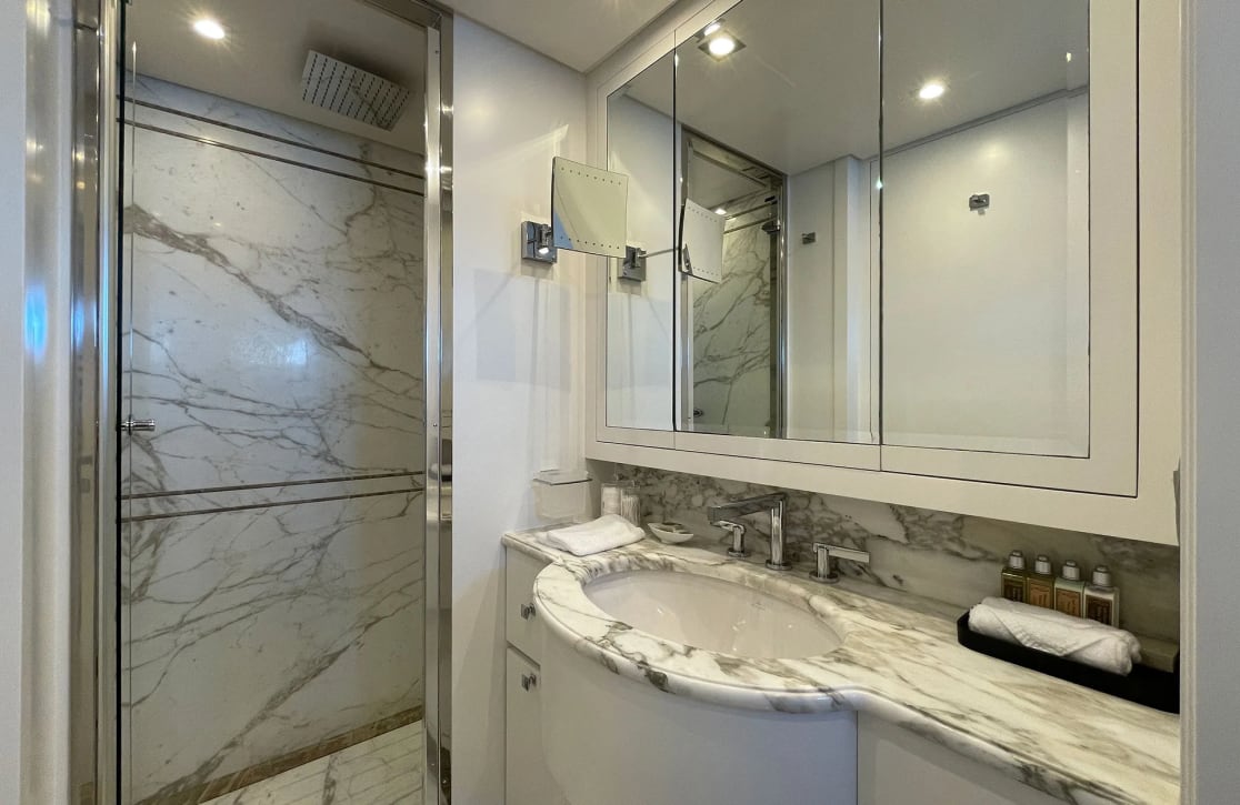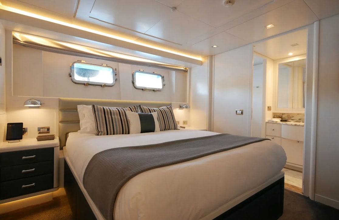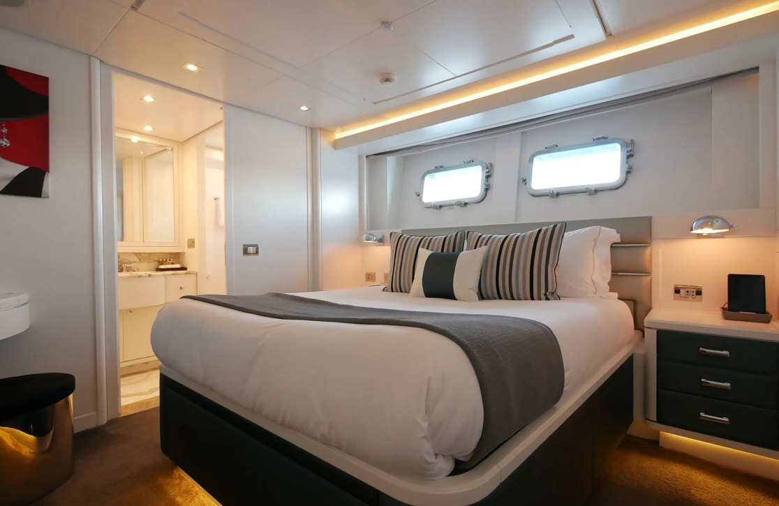 Sud’s accommodations are a testament to refined elegance and comfort, welcoming up to 10 guests within her five beautifully appointed cabins. The master suite is a haven of tranquility, while two VIP and two twin cabins offer serene retreats for all guests. Waking up aboard Sud, you’re greeted by the gentle rocking of the sea and the promise of a new day filled with adventure. With a crew of seven attending to every detail, your experience is crafted with care, ensuring each moment aboard is as effortless as it is memorable.