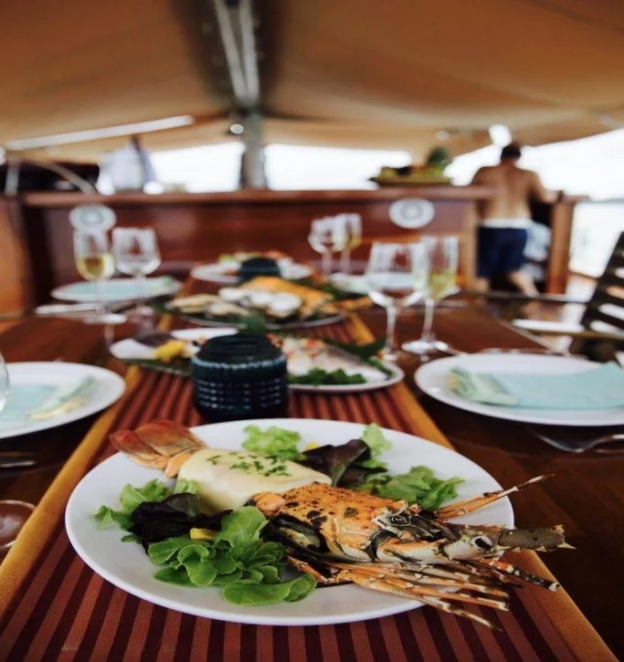 Life aboard The Blue is an exercise in refined comfort and connectivity. With state-of-the-art Wi-Fi, you can effortlessly share your adventures with the world, or choose to remain blissfully disconnected. The yacht’s air-conditioned interiors provide a sanctuary of cool respite after a sun-drenched day at sea. As evening descends, gather with friends in the elegantly appointed salon, where stories of the day’s discoveries unfold over a fine glass of wine.
