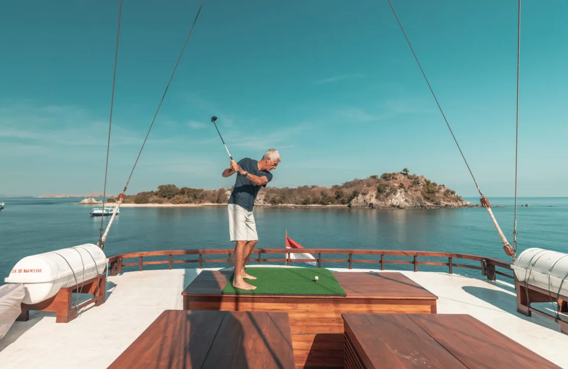 Onboard The Maj Oceanic, each space whispers comfort and style. As the sun sets, gather on the expansive sun deck, where the gentle sway of the yacht complements the warmth of a BBQ under the stars. Whether you’re savoring the fresh sea breeze in the alfresco dining areas or perfecting your swing with a little golf practice, each amenity is designed to enhance your connection with the sea. Here, every detail is curated to ensure that leisure and enjoyment are always at the forefront of your journey.