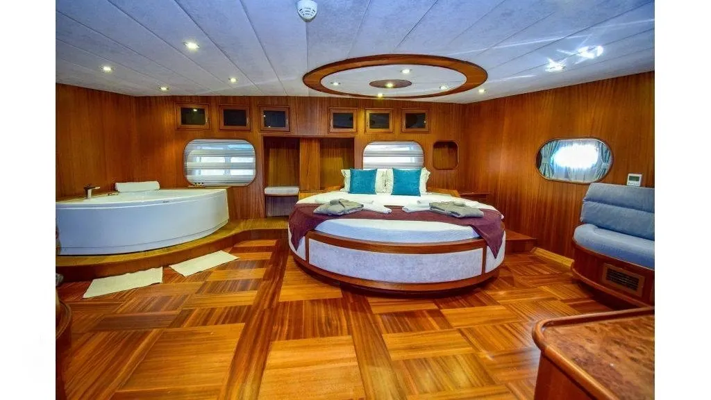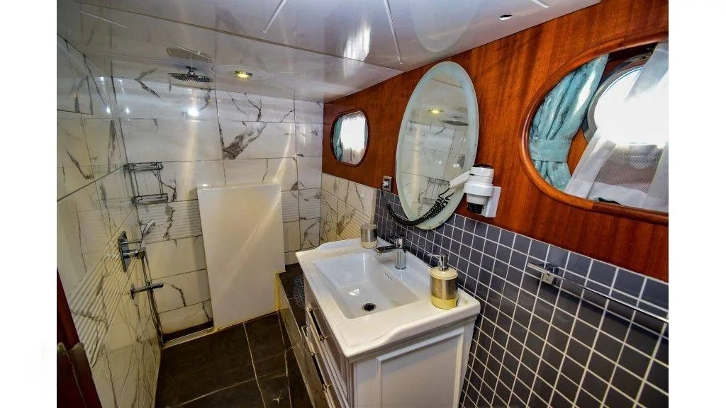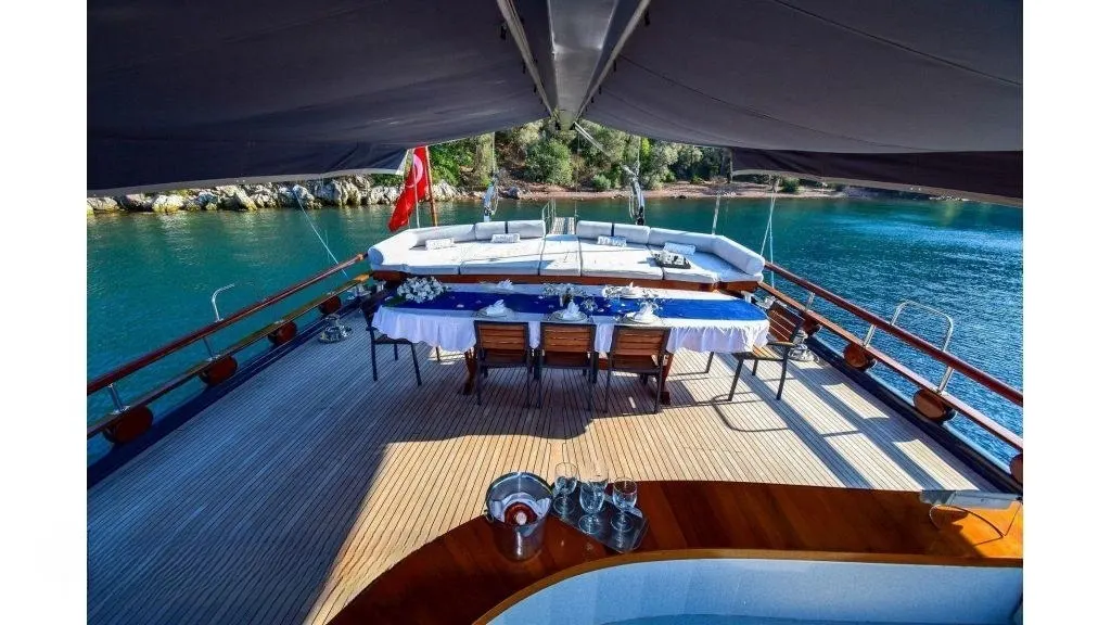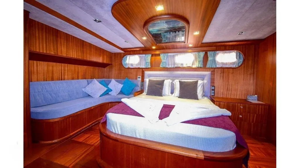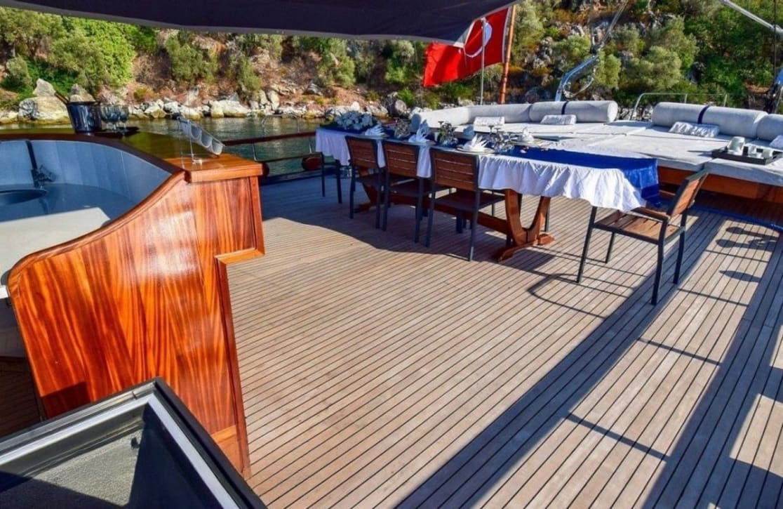 On Ugur, the day begins with the sun kissing the horizon as you enjoy breakfast on the expansive deck, followed by a leisurely afternoon lounging on sunpads under the warm embrace of the sun. Stay connected with Wi-Fi as you unwind in the cool comfort provided by the yacht’s air conditioning. As evening falls, gather with friends and family for a starlit dinner, where the gentle lapping of the waves provides a soothing soundtrack to your culinary experience.