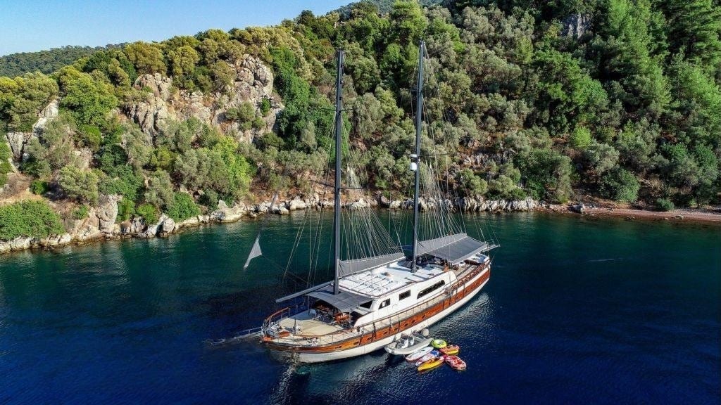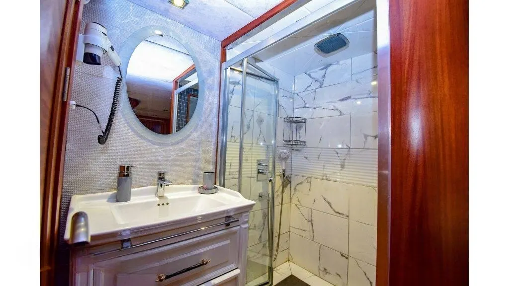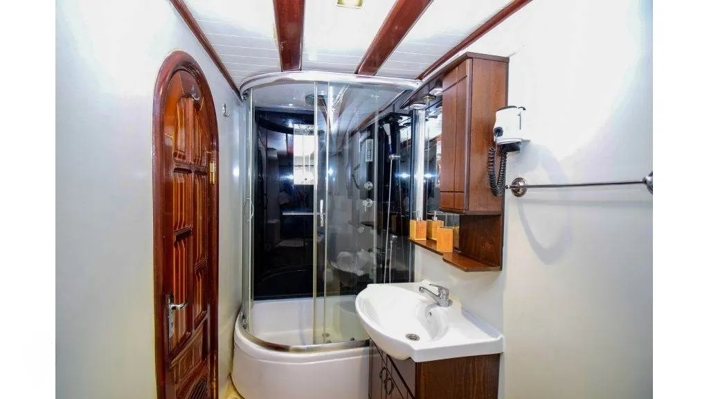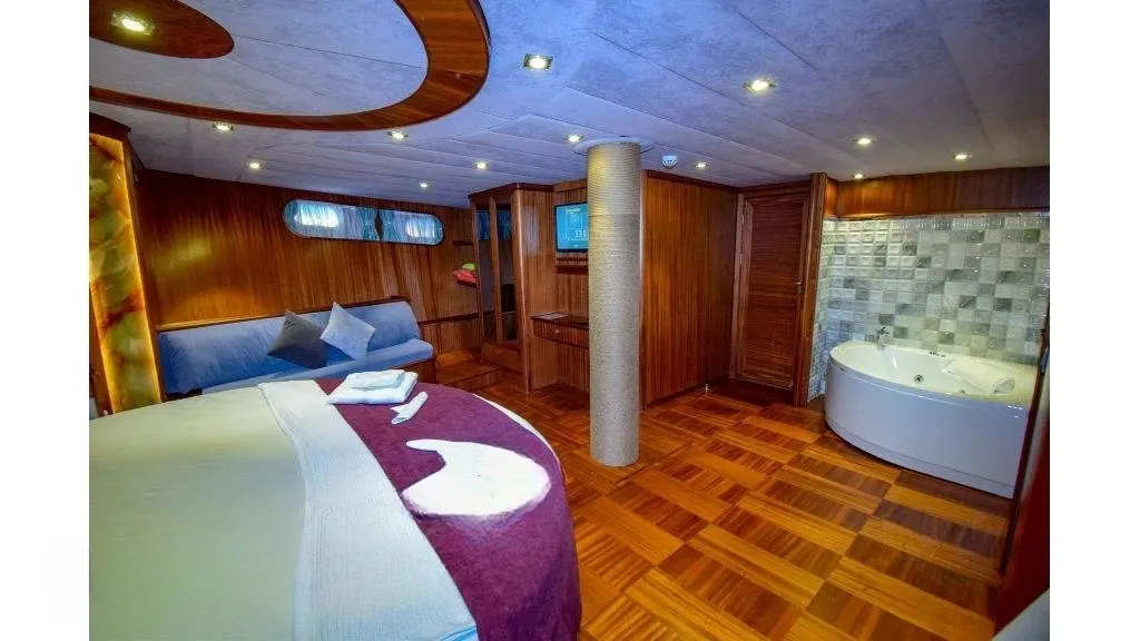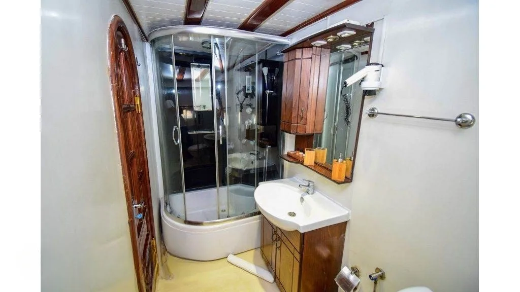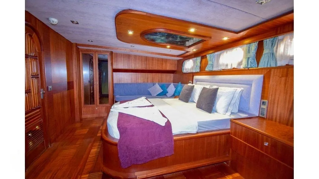 On Ugur, the day begins with the sun kissing the horizon as you enjoy breakfast on the expansive deck, followed by a leisurely afternoon lounging on sunpads under the warm embrace of the sun. Stay connected with Wi-Fi as you unwind in the cool comfort provided by the yacht’s air conditioning. As evening falls, gather with friends and family for a starlit dinner, where the gentle lapping of the waves provides a soothing soundtrack to your culinary experience.