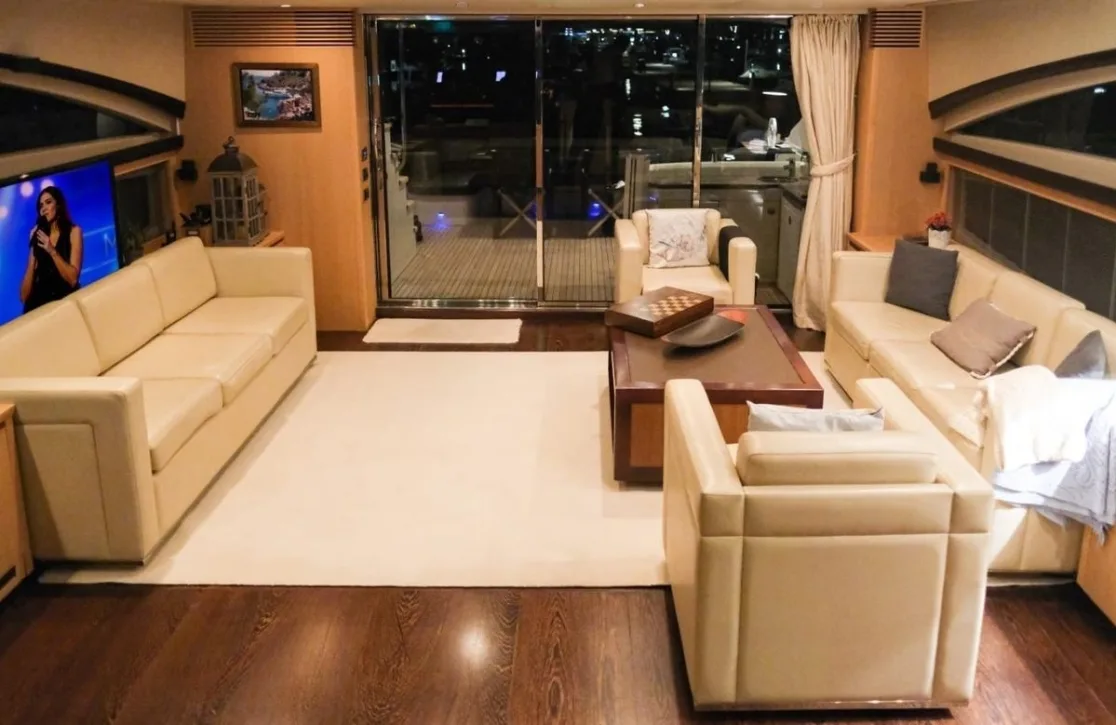 Life aboard ‘Via’ is a seamless blend of comfort and sophistication. Imagine enjoying the cool breeze on the deck as you unwind in the spacious outdoor living areas, perhaps catching up on the latest news or your favorite series with the yacht’s reliable Wi-Fi. Inside, the climate-controlled air conditioning offers a respite from the midday sun, allowing you to relax in the refined interiors designed by Princess. Whether hosting an intimate gathering under the stars or enjoying a quiet afternoon with a good book, every corner of ‘Via’ is tailored for your enjoyment.