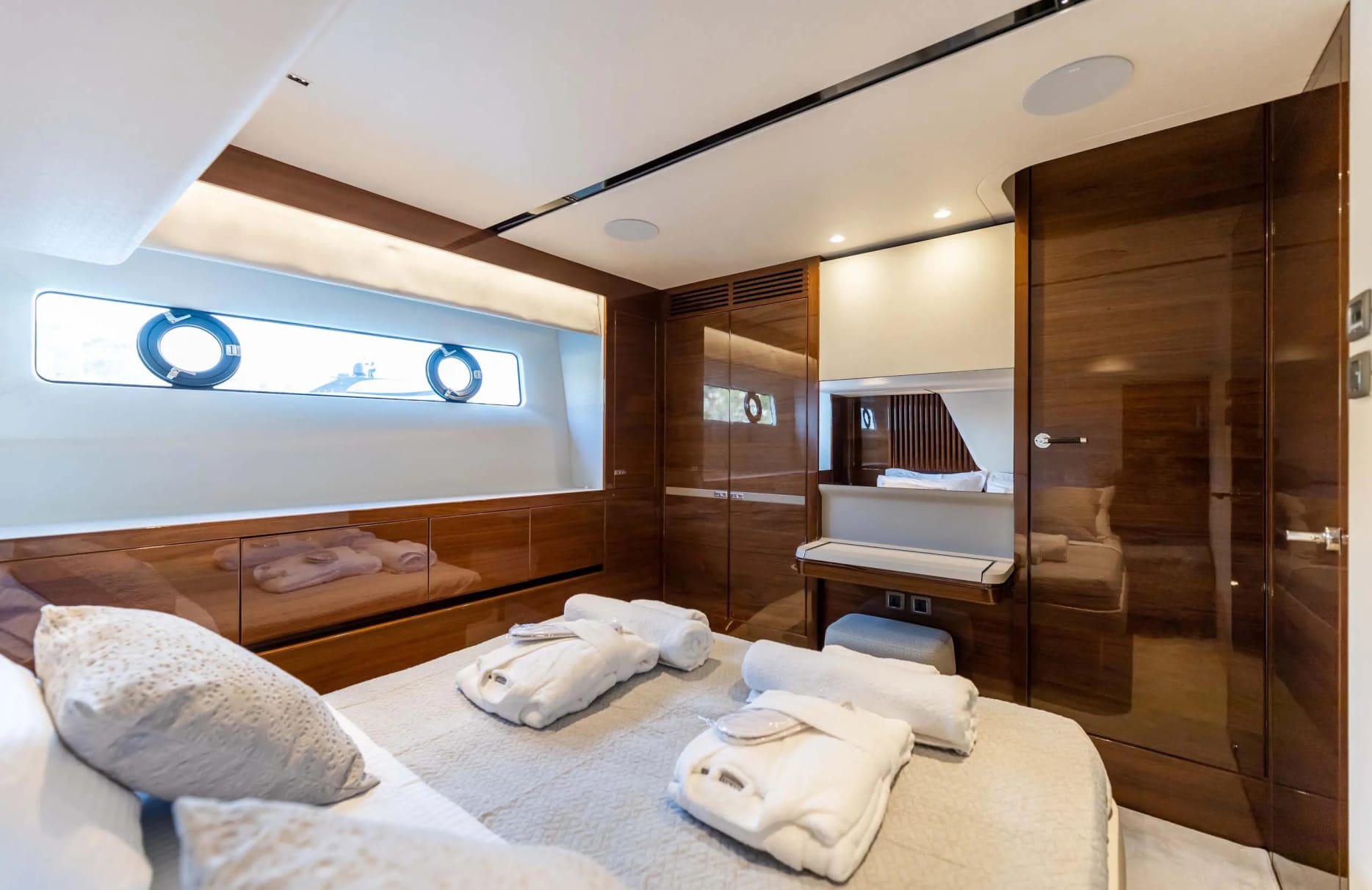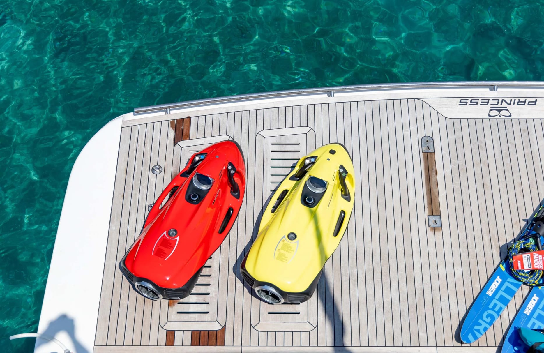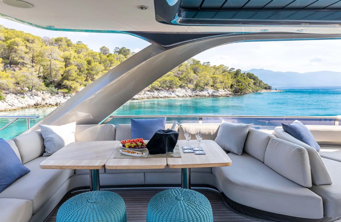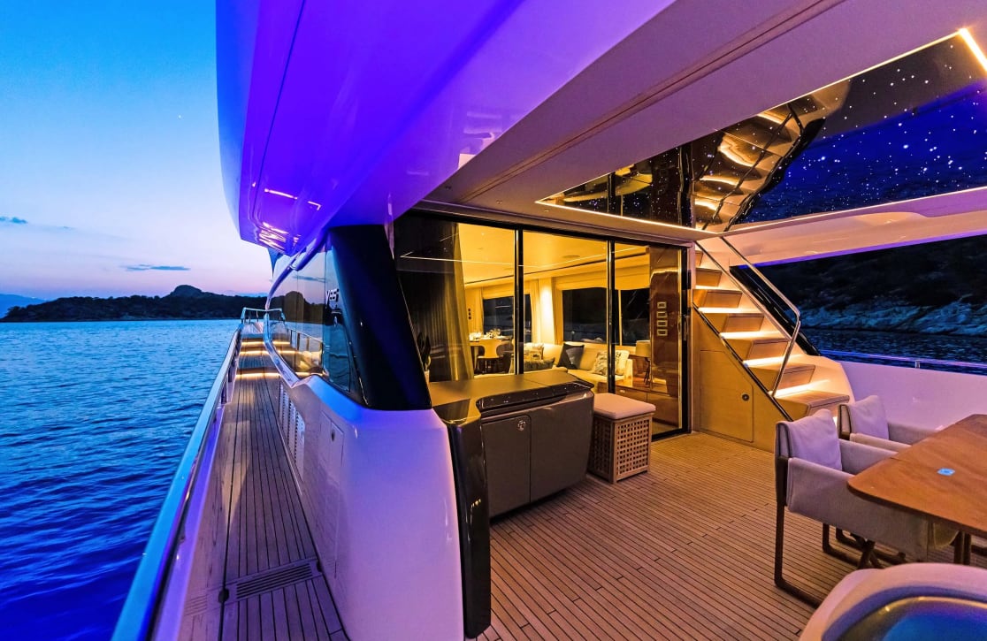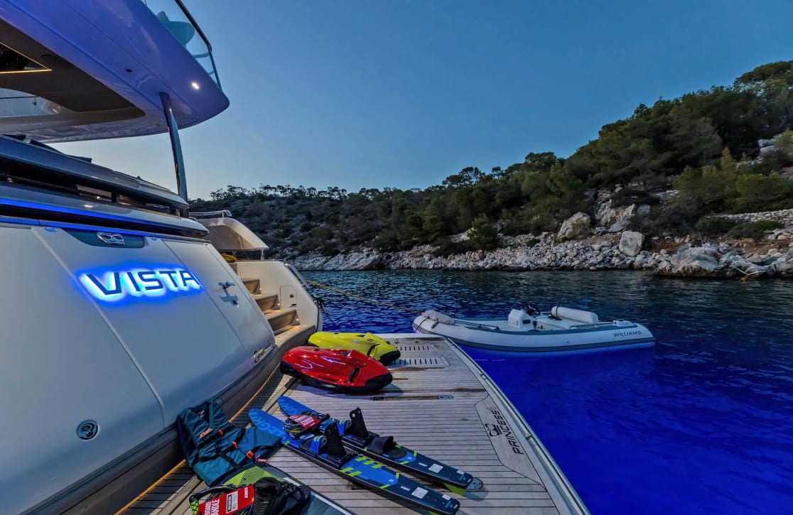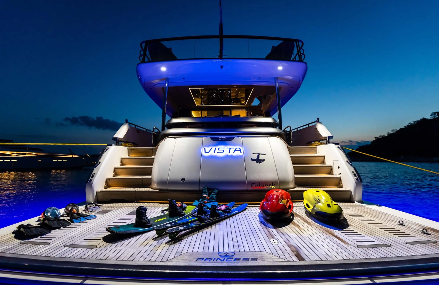 Crafted by the esteemed Princess shipyard, the motor yacht Vista invites you to embark on a journey where elegance meets exhilarating adventure. With her sleek 26-meter silhouette cutting gracefully through the waters, she is not merely a vessel, but a canvas upon which unforgettable memories are painted. As you cruise at a serene pace of 21 knots or feel the thrill of reaching up to 33 knots, Vista promises both tranquility and excitement. Days aboard unfold with leisurely mornings on the sun-drenched deck, afternoons exploring hidden Mediterranean gems, and evenings transformed by mesmerizing underwater lights that dance beneath the waves.