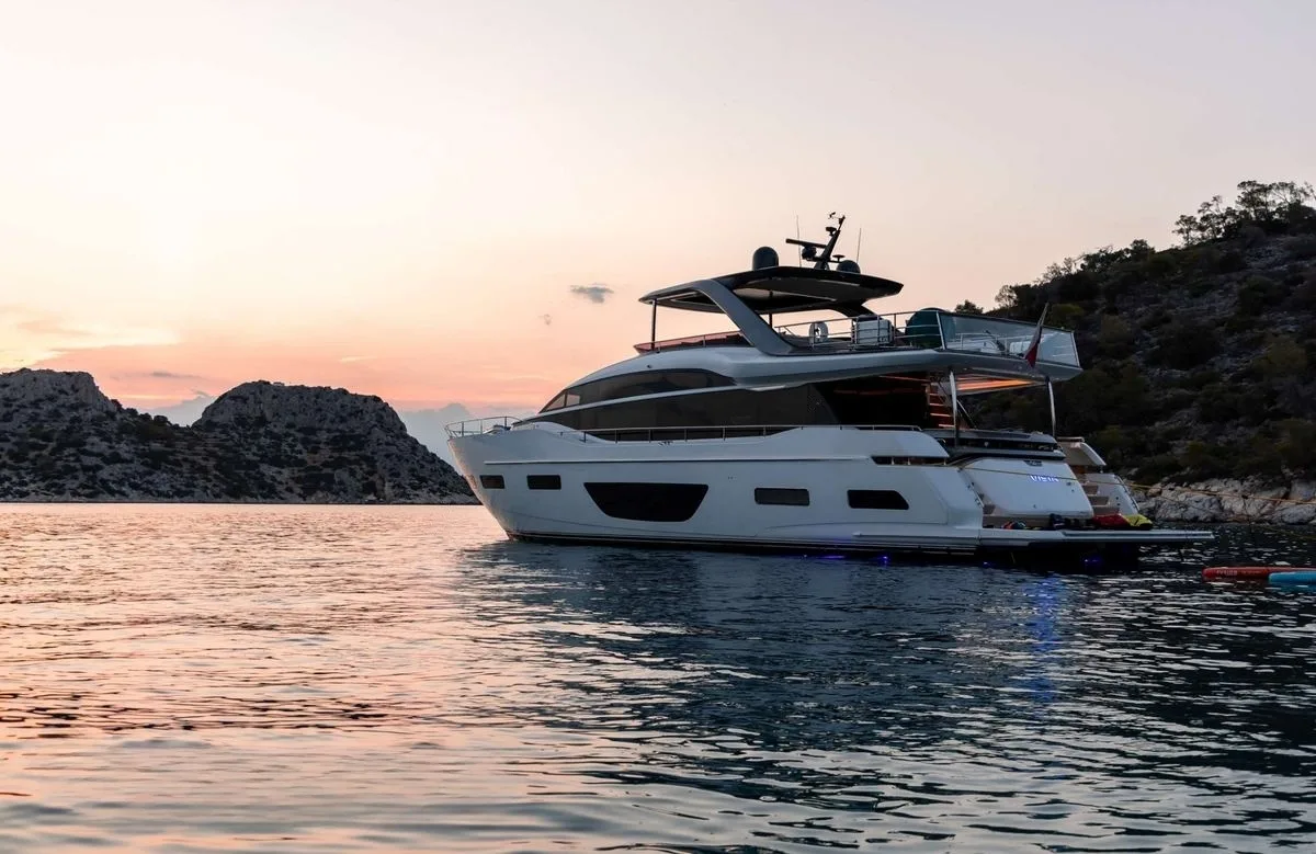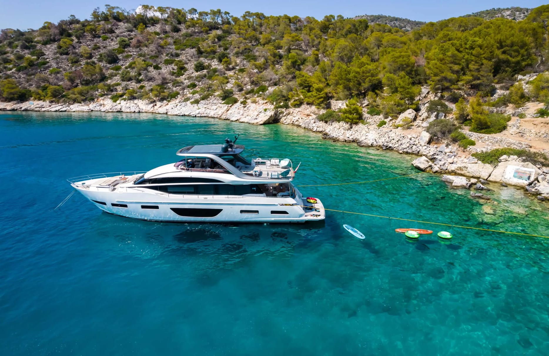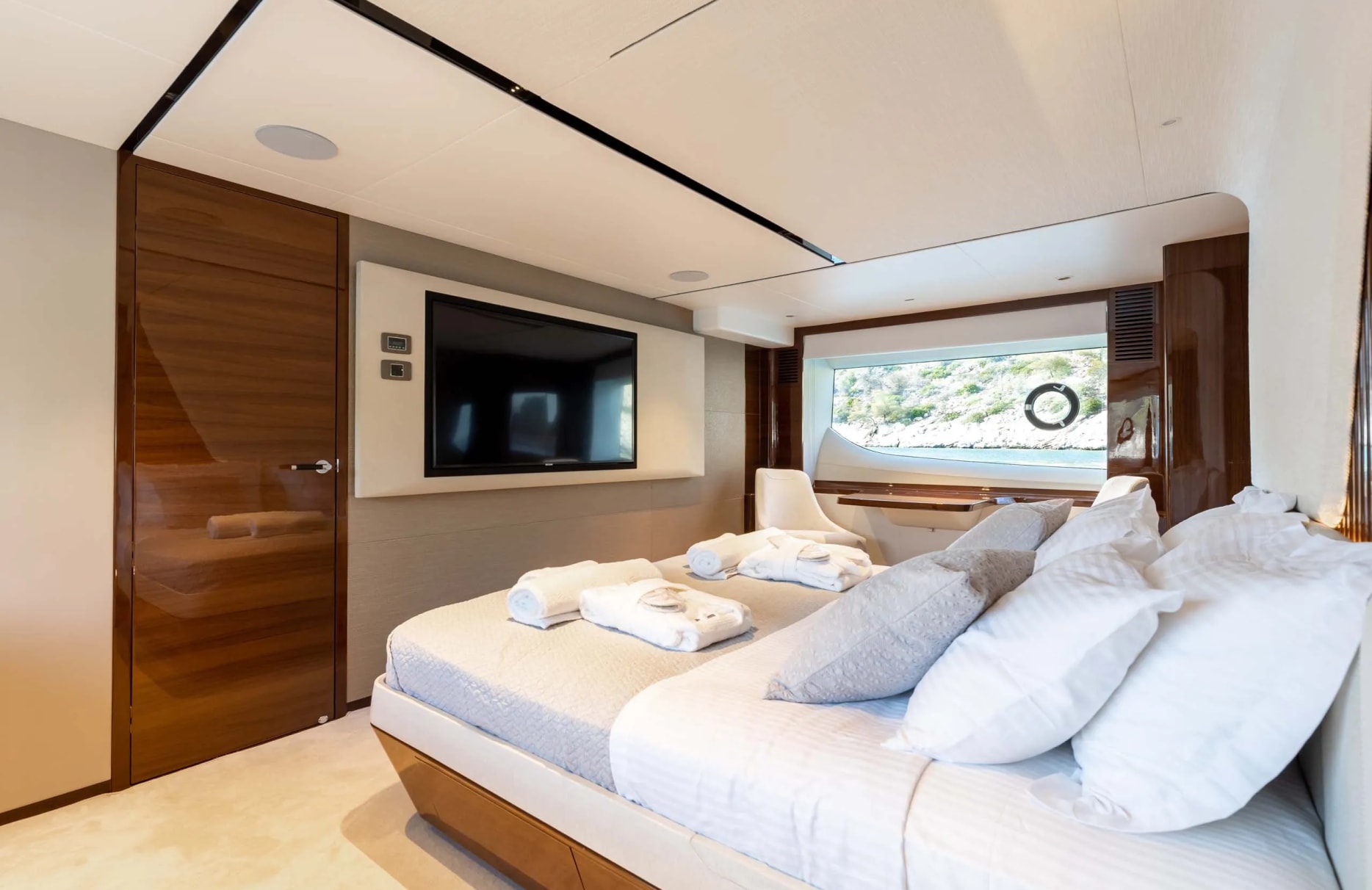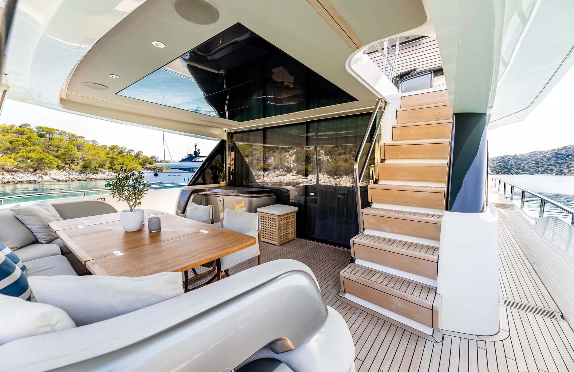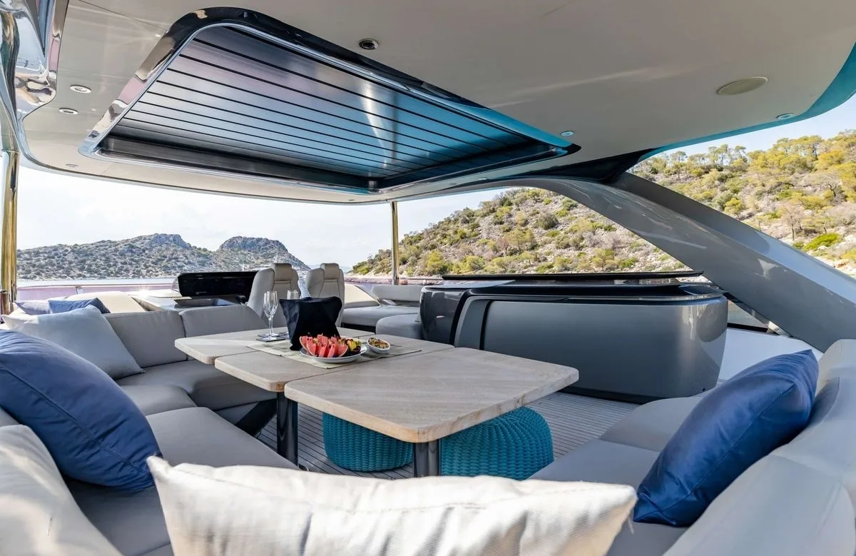 Crafted by the esteemed Princess shipyard, the motor yacht Vista invites you to embark on a journey where elegance meets exhilarating adventure. With her sleek 26-meter silhouette cutting gracefully through the waters, she is not merely a vessel, but a canvas upon which unforgettable memories are painted. As you cruise at a serene pace of 21 knots or feel the thrill of reaching up to 33 knots, Vista promises both tranquility and excitement. Days aboard unfold with leisurely mornings on the sun-drenched deck, afternoons exploring hidden Mediterranean gems, and evenings transformed by mesmerizing underwater lights that dance beneath the waves.