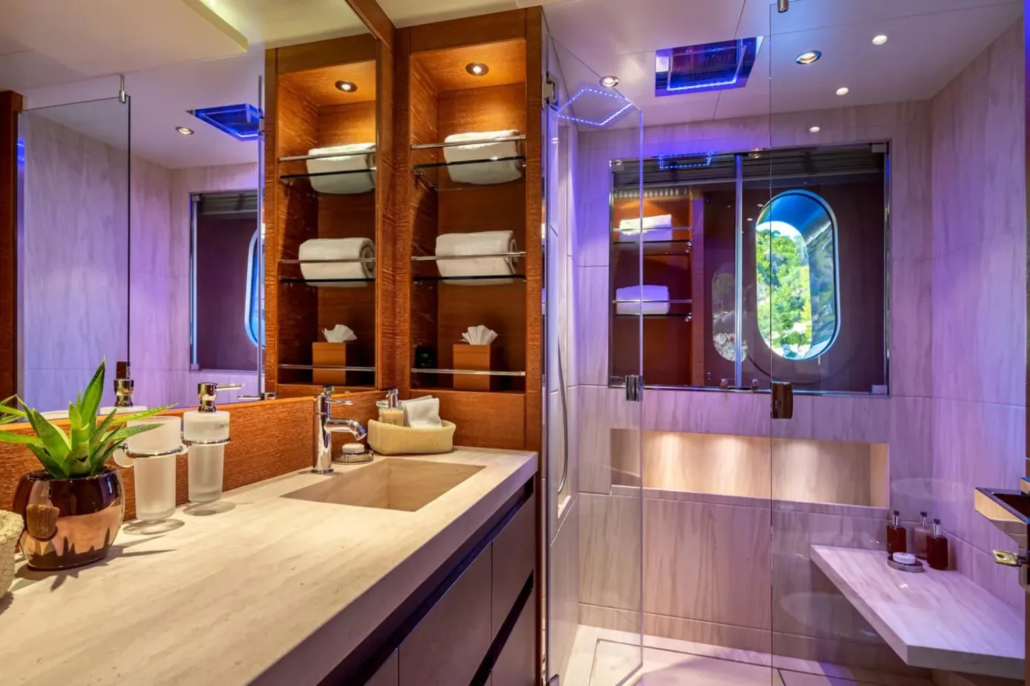 Zaliv III graciously accommodates up to 12 guests in six splendid cabins, each designed to offer a sanctuary of comfort and style. As daylight filters through, waking up in the master suite feels like a gentle embrace, complete with a private study and lavish en-suite facilities. The additional five suites are equally inviting, with configurations that cater to varied preferences, all enveloped in a warm, sophisticated ambiance. The attentive presence of 11 crew members ensures that every need is met, allowing guests to focus solely on relaxation and enjoyment.